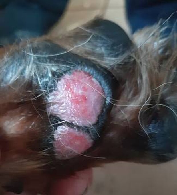 bei dieser noch unerforschten Erkrankung kommt es zur Ablösung des Ballenhornes an den Pfoten. Dies kann zu Lahmheiten, Schmerzen, Selbsttraumatisierung und Infektionen führen.